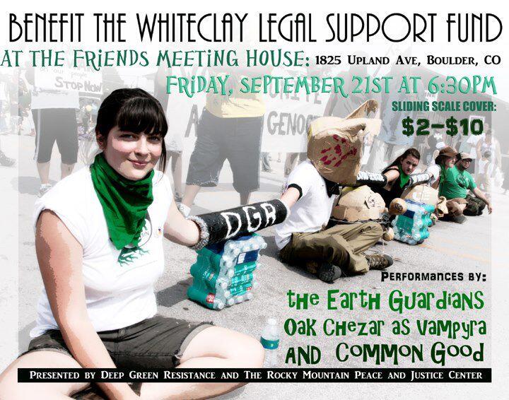 Deep Green Resistance and the Rocky Mountain Peace & Justice Center are hosting a benefit concert on Friday, September 21st at the Friends’ Meeting House (1825 Upland Ave) at 6pm. The Earth Guardians and Common Good will be contributing musical performances, and Oak Chezar will be doing a standup comedy act at the event to raise money for the legal defense of five activists who were arrested at a protest near the Pine Ridge Indian Reservation last month.